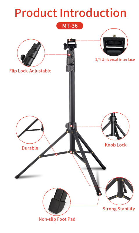 Jmary MT-38 Extendable Tripod Stand Model:MT-38 Folded Height:515mm Minimum Height:590mm Maximum Height:1680mm Max Load: 3kg/6.6lbs Tripod Sections: 4 Packing List:Tripod/Mobile clip